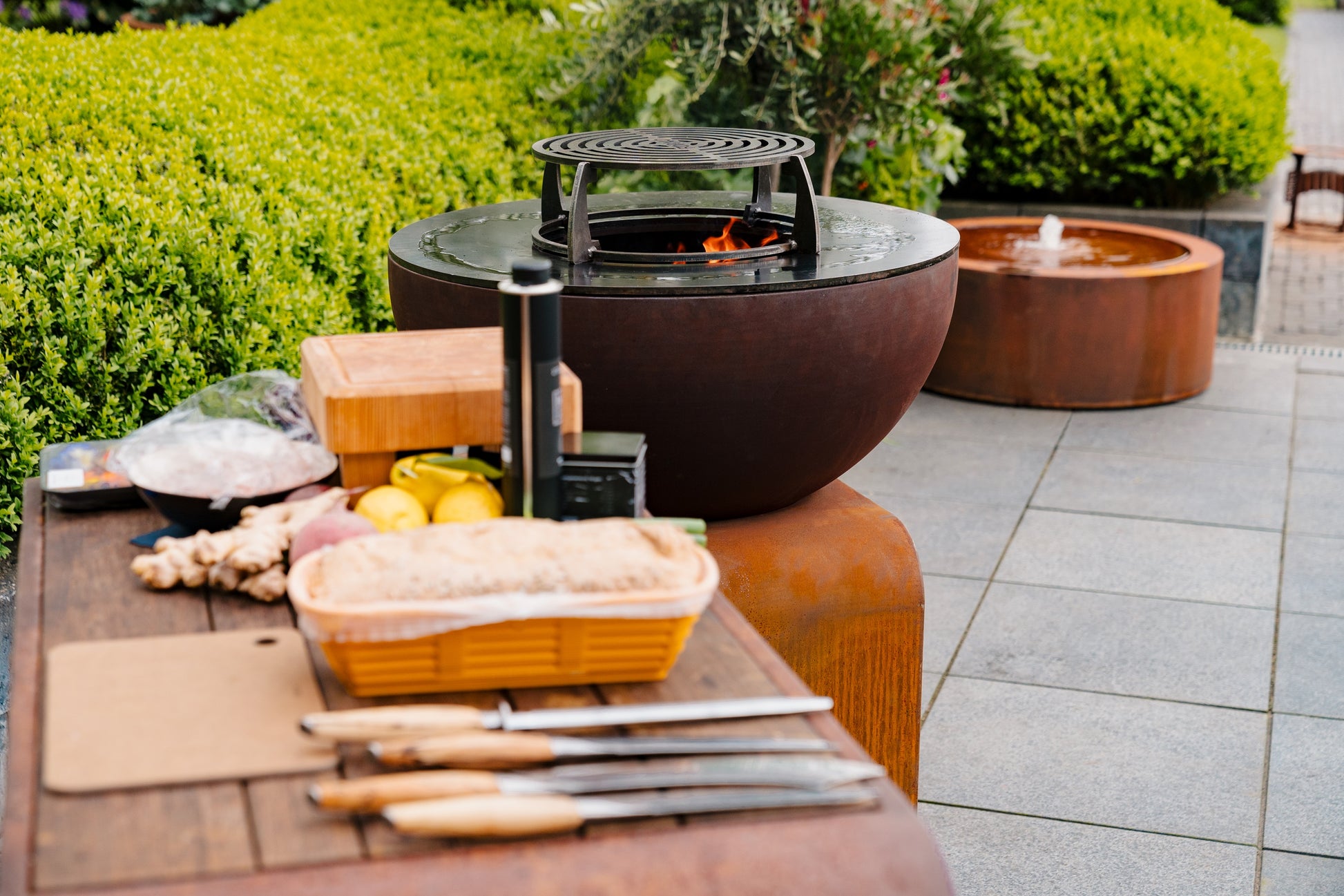 Sur le dessus se trouve une plaque de cuisson en acier S235 de 10 mm d’épaisseur, qui atteint une température de 275 à 300 °C après environ 15 à 25 minutes de chauffe – idéale pour saisir viandes, légumes ou plats végétariens directement au feu.