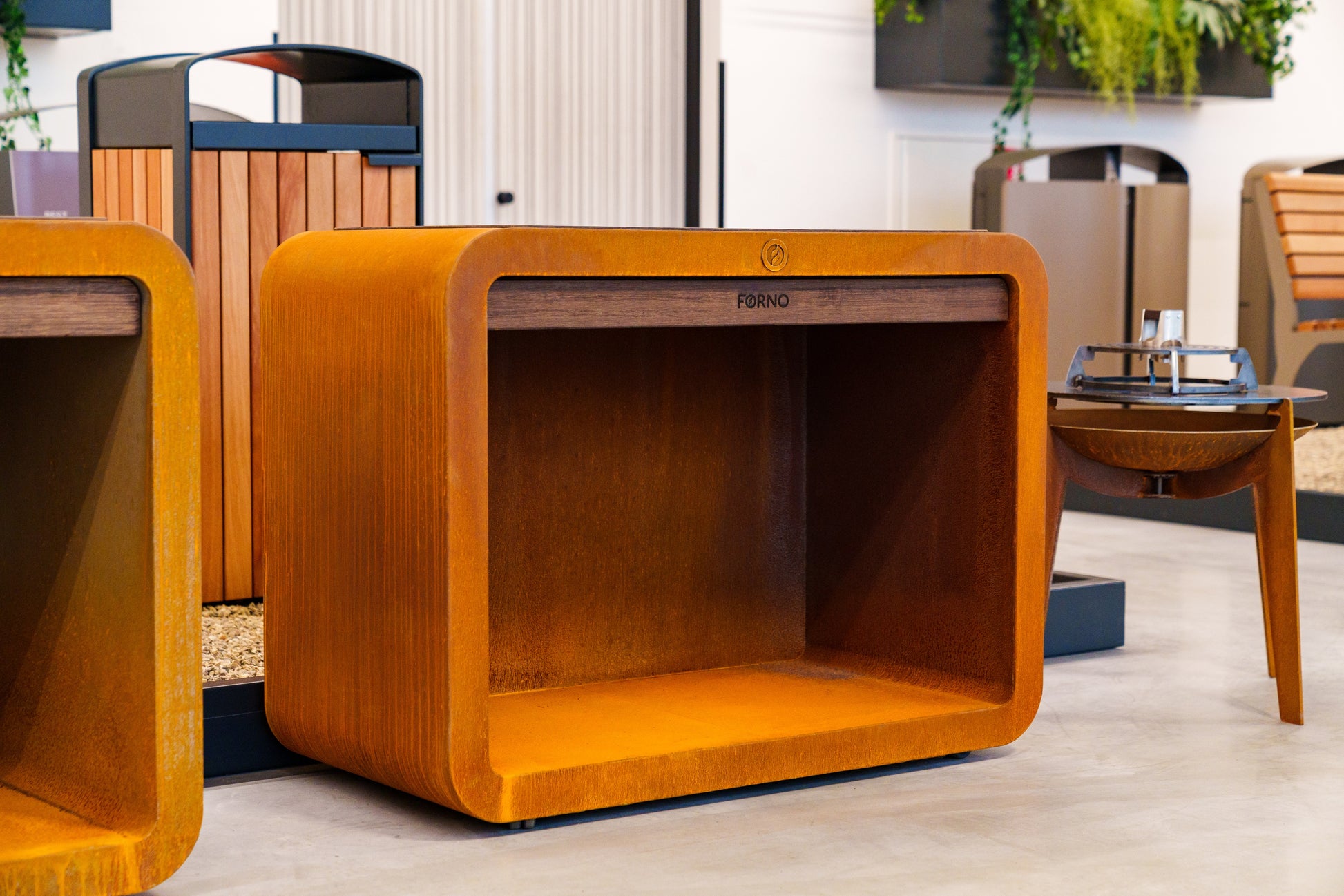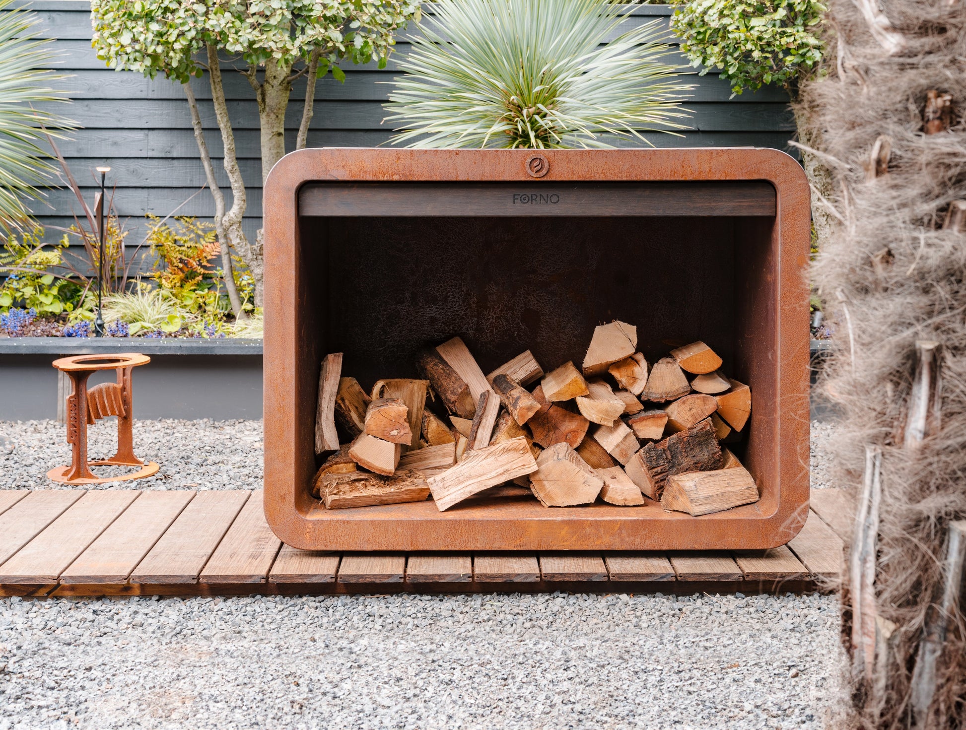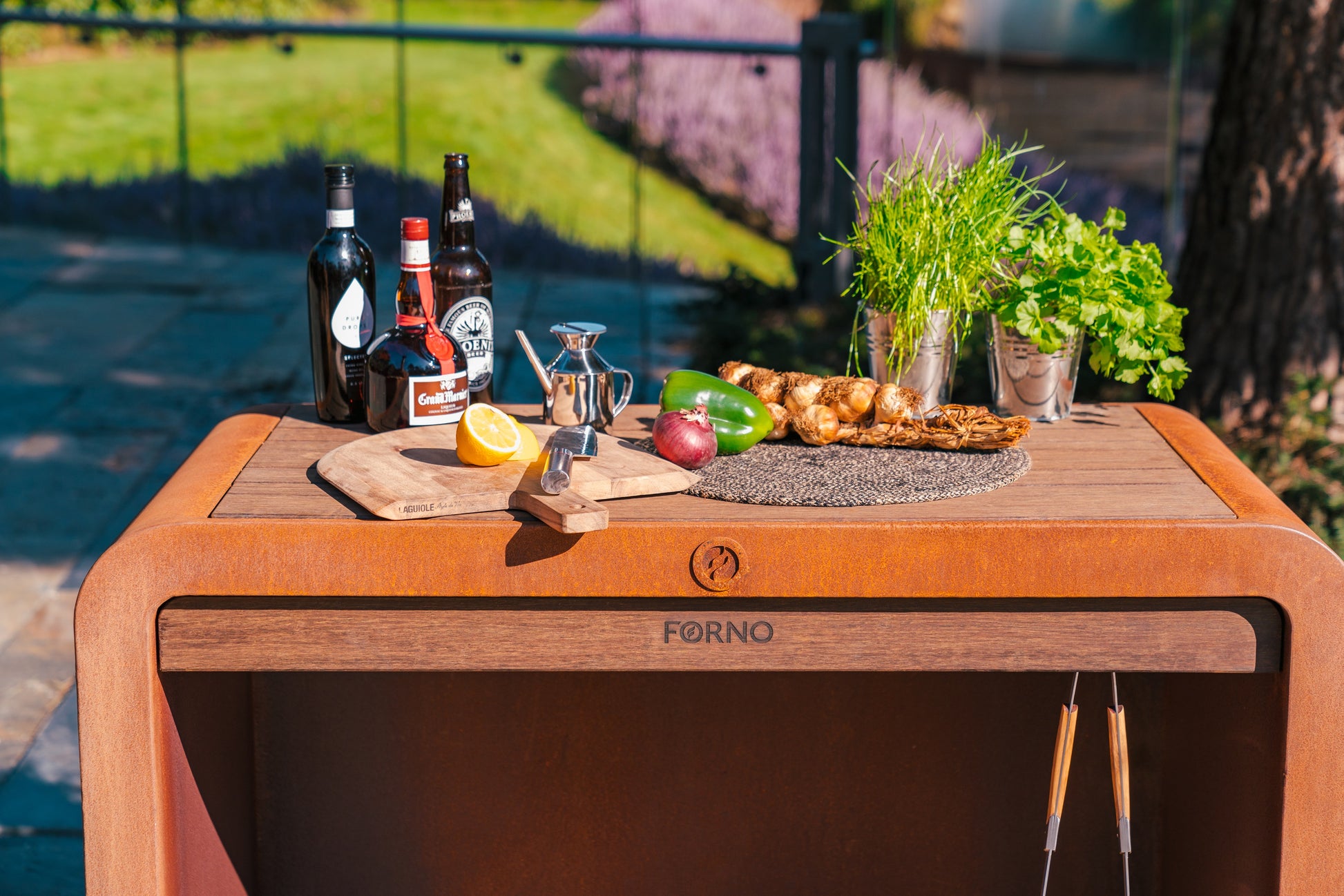 La station FORNO® Standard offre une surface de rangement en acier Corten stable et élégante, idéale comme espace de travail ou de stockage pour les cuisines extérieures, fours à pizza ou stations de grillade.
